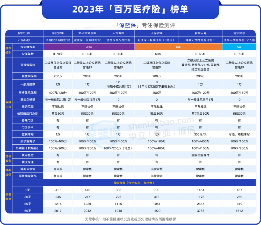 深蓝君将市面上在售的几百款百万医疗险,都测评了一遍,筛选出了几款保障全面而且有保证续保期的产品,供大家参考: