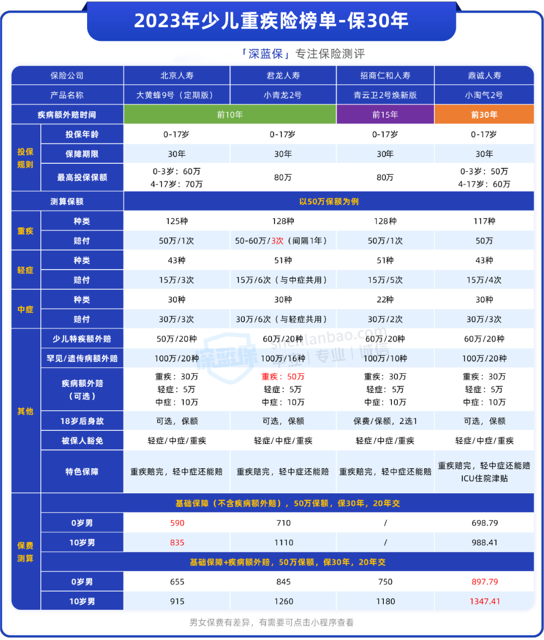 并且性价比较高,0岁男宝选基础保障,买50万保额,交20年的话,每年只要590元,附加前10年额外赔后,也只要655元。