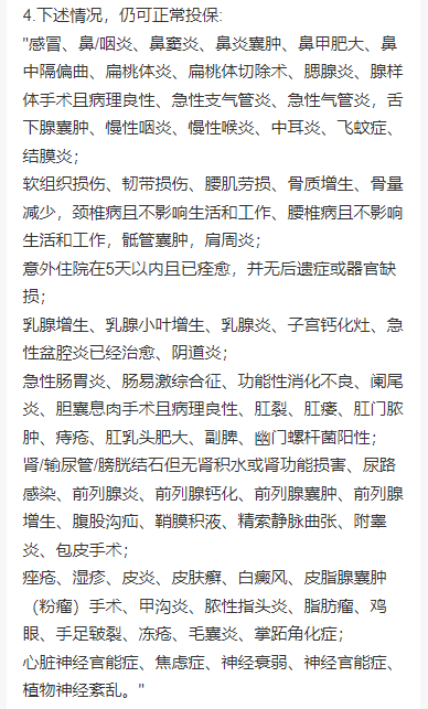 可以看到,像乳腺增生、痔疮、白癜风等疾病,都可以正常承保。