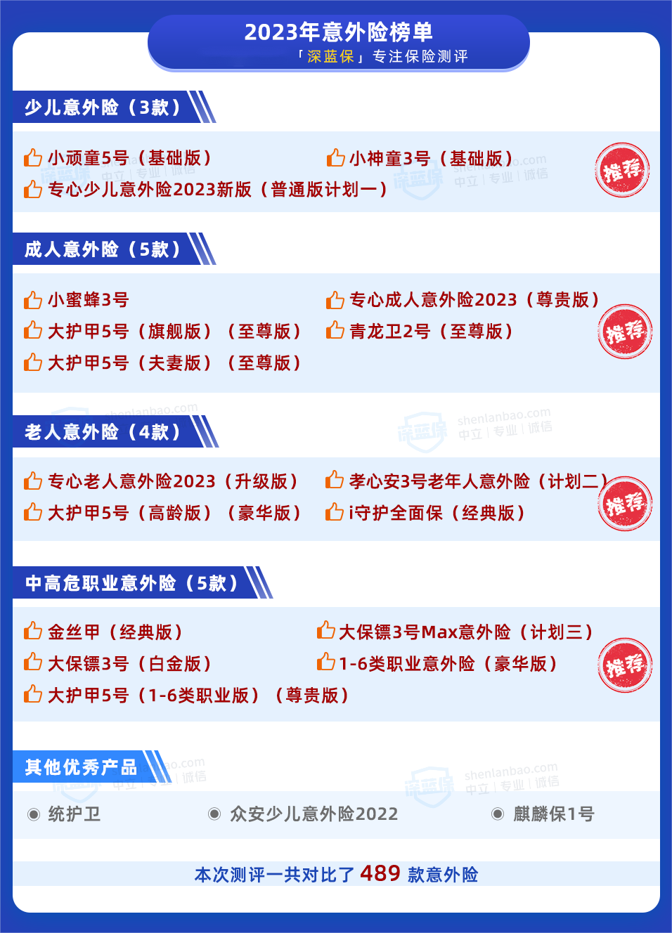 本期测评了489款产品,总结出了意外险榜单,内容如下: