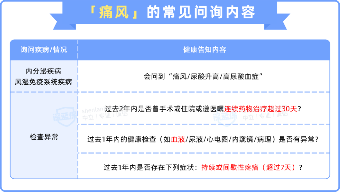 百万医疗险和重疾险对健康的要求比较严格,除了会问到“痛风”、“高尿酸血症”,还可能涉及一些药物治疗、疼痛、血液检查异常等问询。