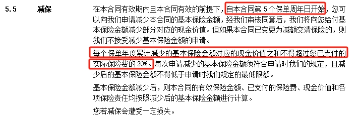 合同生效满5年后,可以申请减保,每年减保不超过实际已交保费的20%。