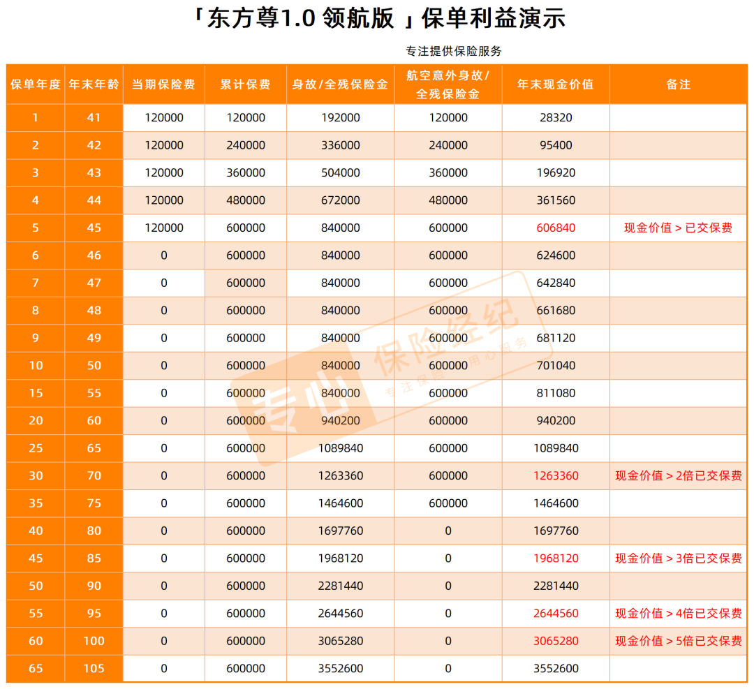 我们把岁数为5的整数倍和一些重点年龄的保单现金价值表示出来了,其中红笔标注的,是需要特别注意的年份和数据。