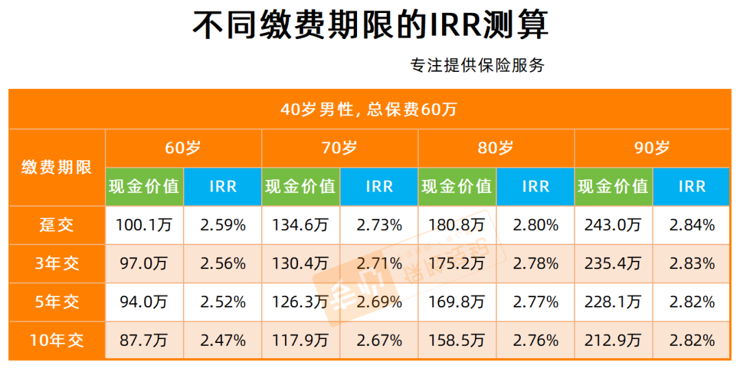 测算条件同样是:40岁男性,总保费60万,5年交。