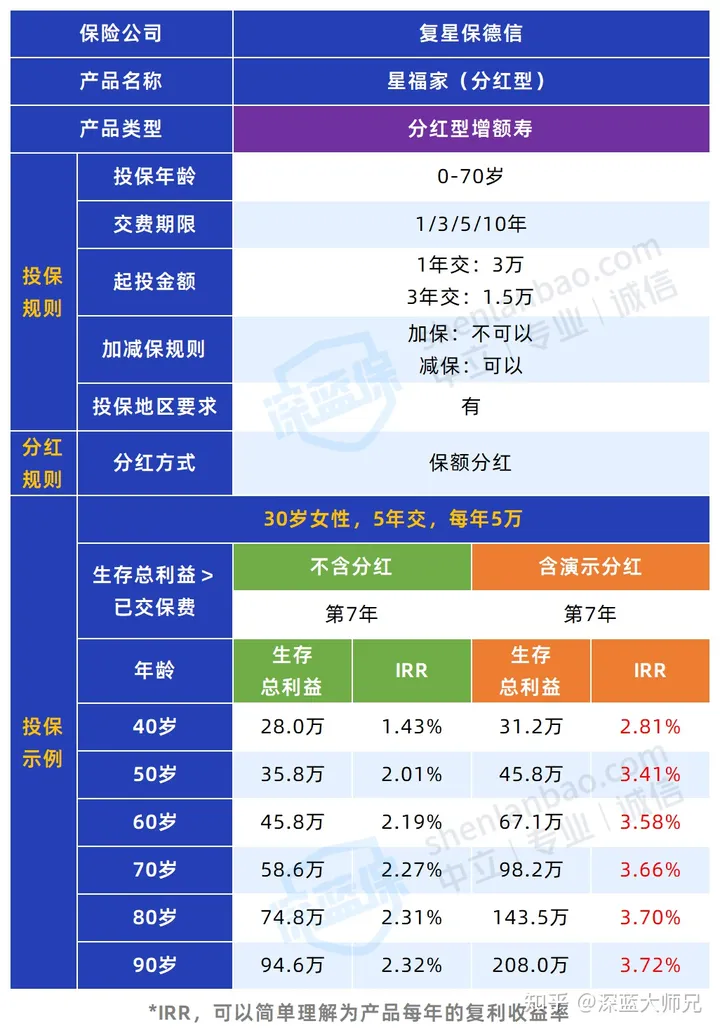 简单来看,星福家是一款基本预定利率为2.5%的产品,但它属于分红型增额寿,浮动收益的潜力很大。