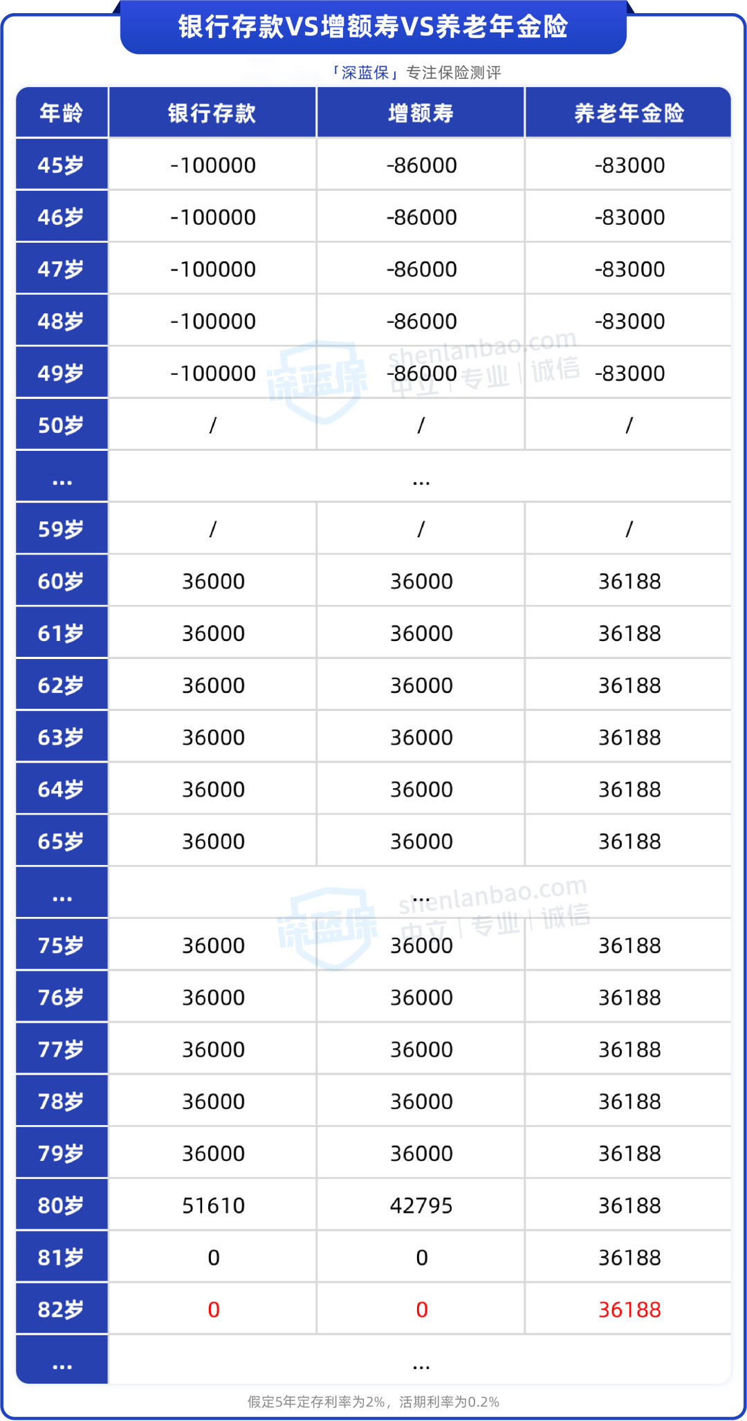 但按照增额寿、银行定存养老的计划,寿命一旦超过80岁,就会陷入没钱养老的尴尬境地。想要有终身的养老钱保障,还得看养老年金险。