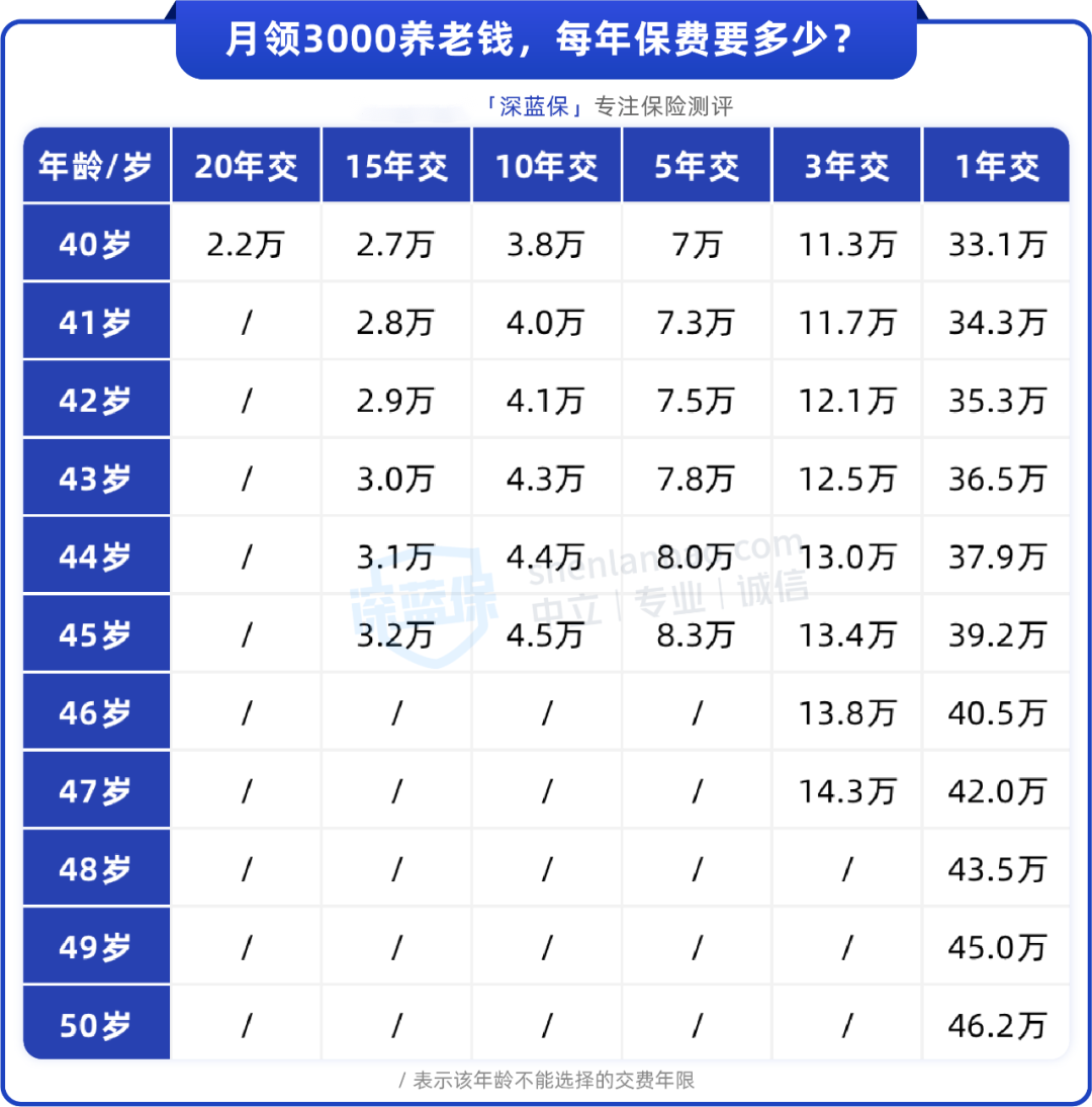 年龄在四五十岁的朋友,如果你也想要多拿三千养老钱,就可通过这张表,了解到自己目前大致需要交多少保费。比如40岁选择10年交,就需要每年交3.8万。