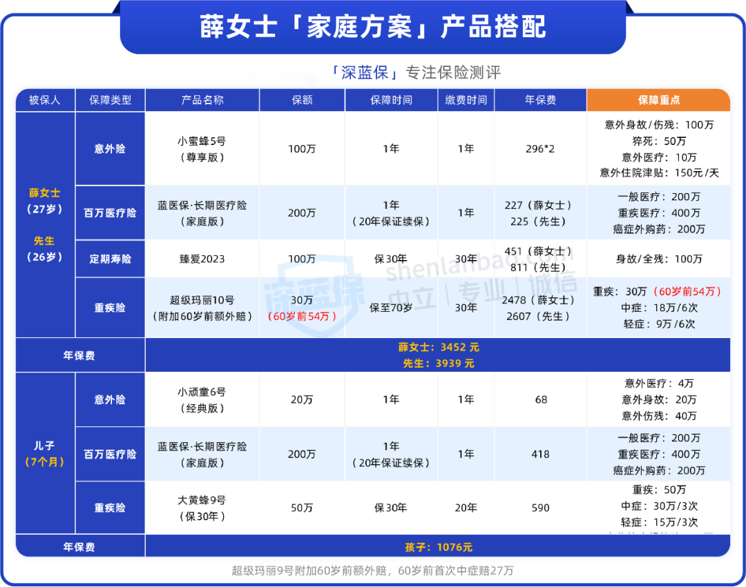 针对他们家的情况,我们设计了以下方案,人均只要2800出头,保额都买得很高: