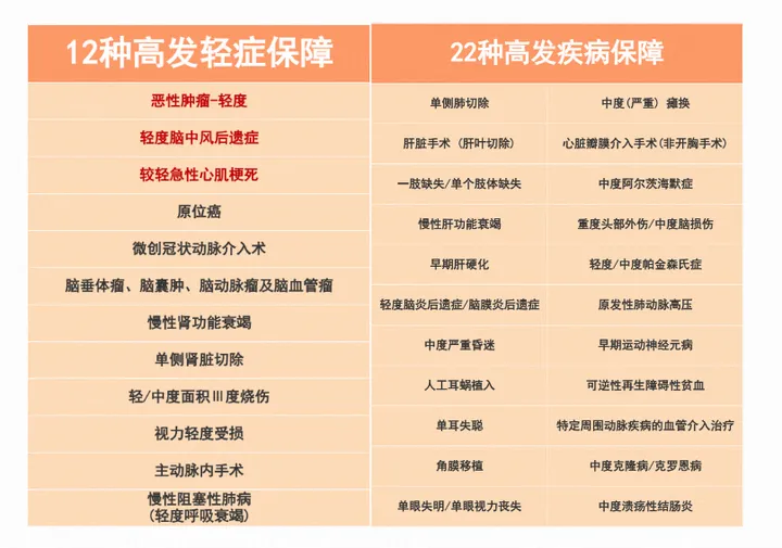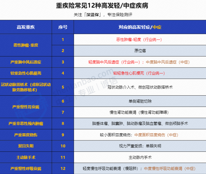 我总结了12种高发轻/中症的表格,大家可以自行对照表格,看看产品包含的高发病种是否有缺失。
