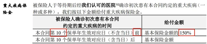 如上图,仅限投保前10年能额外赔。如果0岁孩子投保,只能保到10周岁,在保障时间上就远不如能保到60周岁的。