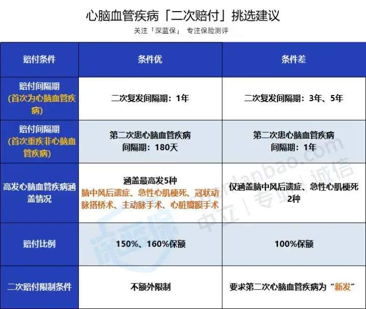 心脑血管疾病的二次赔付条件要稍微复杂一些,我同样整理出了一张表格供大家参考: