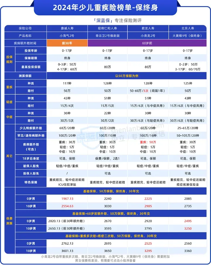 表中还有一款青云卫2号焕新版少儿重疾险,选保终身时,可附加重疾多次赔、60岁前额外赔等保障,