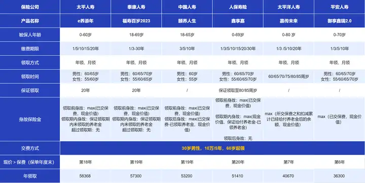 咱们直接以30岁男性,分5年,每年投10万为例,等到60岁退休,领钱最多的是,太平人寿的e养添年,每年到手5.8万,只要领个9年,投入的钱就回来了。