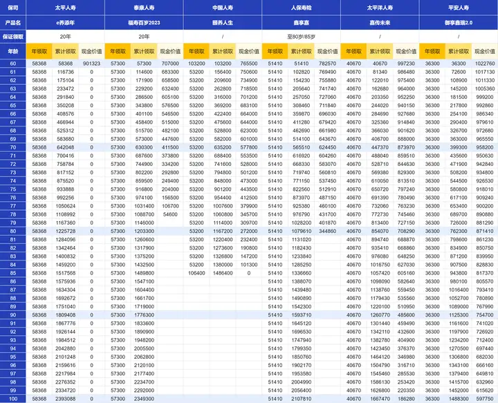 那这6款产品中呢,e养添年、福寿百岁2023是保证领取20年,鑫享嘉是保证领取到80岁。