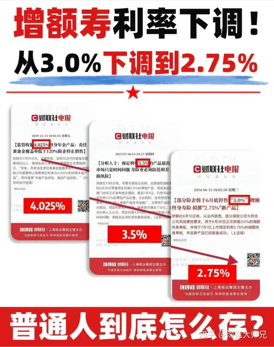 重磅消息!就在昨天财联社官方公布,部分险企将在6月底停售3.0%的增额寿,7月1直接推出2.75%的新产品: