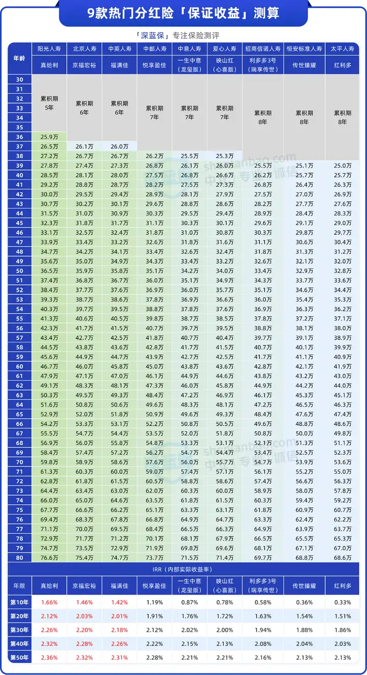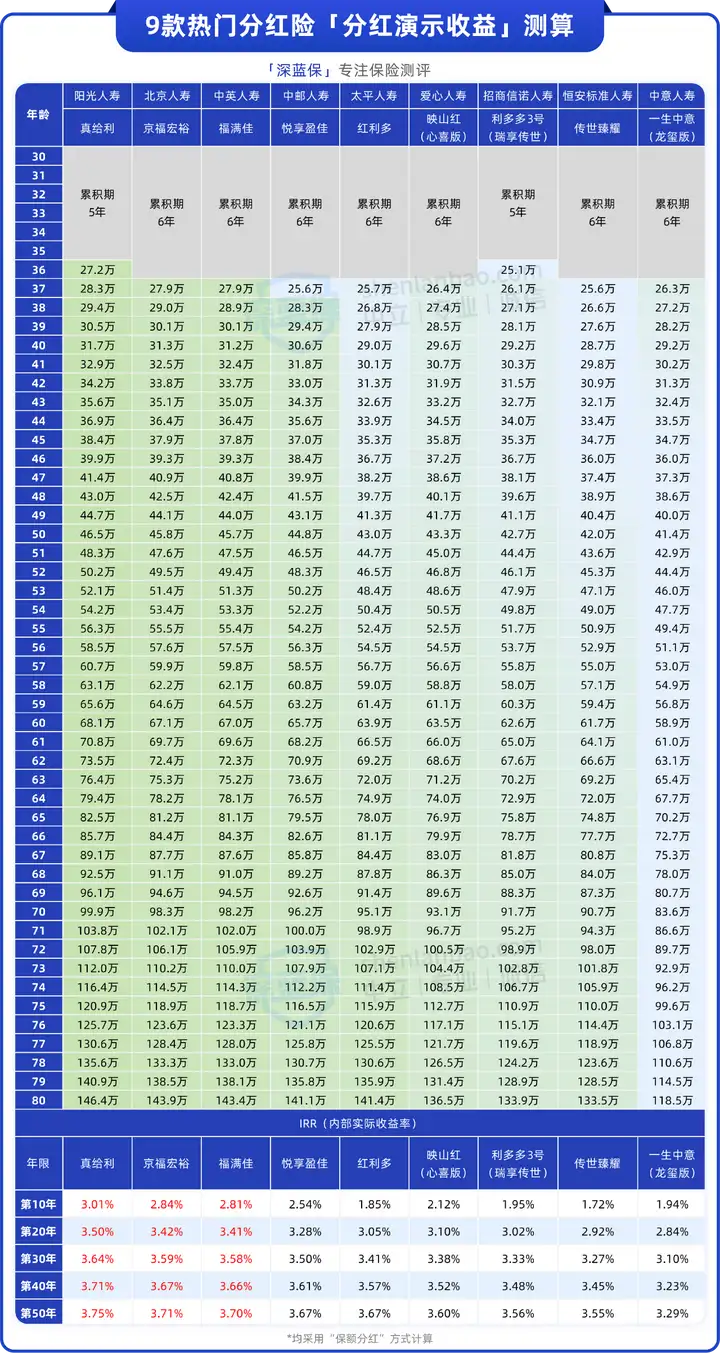 不过也可以看到,保证部分的复利IRR,再高也就2.3%左右,想要高收益的话,还得看分红的表现。