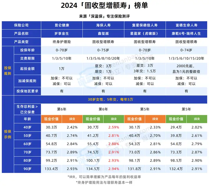 今天我们整理出了3.0%增额终身寿险榜单,并且以“30岁女性,5年交,每年交5万”为例,测算了产品的收益,供大家参考: