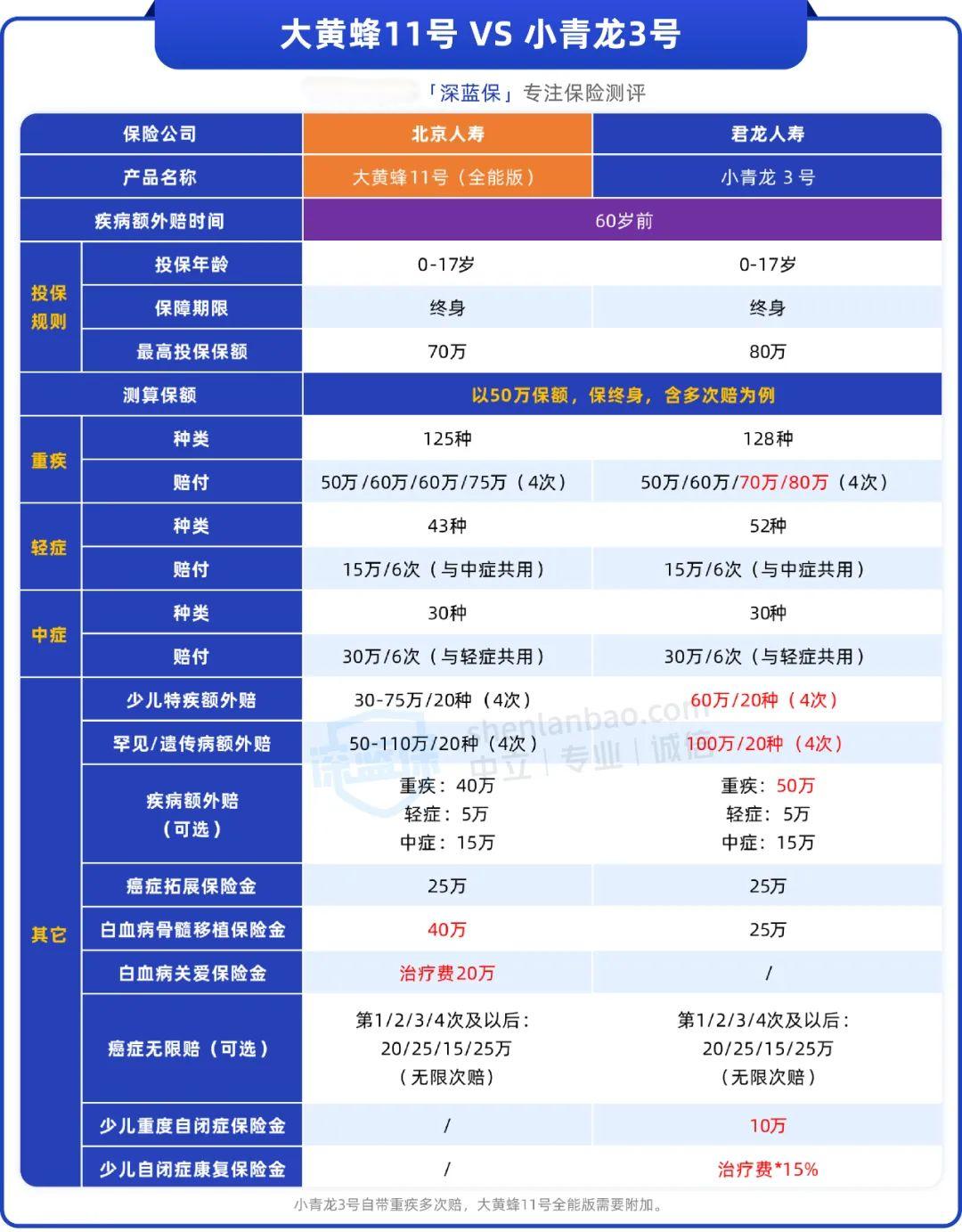 由于小青龙3号自带重疾多次赔,为了方便比较,我们同样以大黄蜂11号,附加重疾多次赔为例,来进行详细对比。