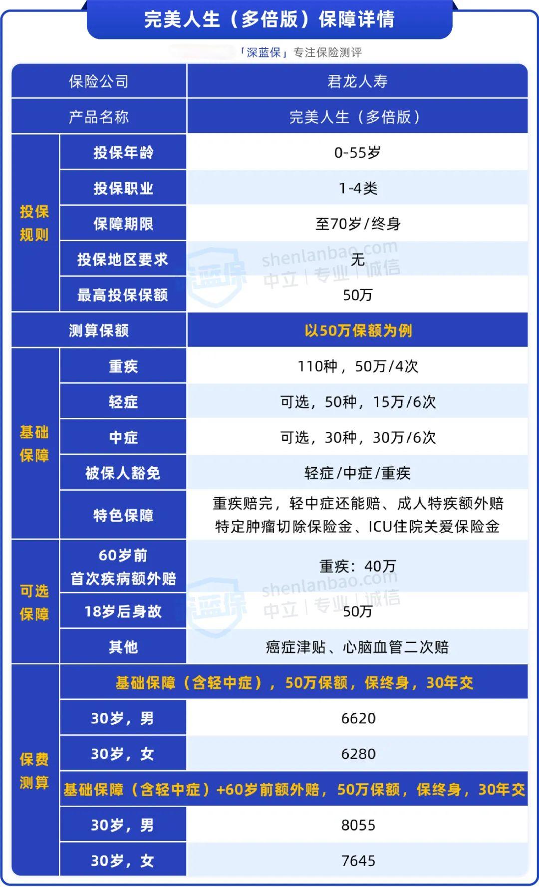 完美人生(多倍版)由君龙人寿承保,保障如下: