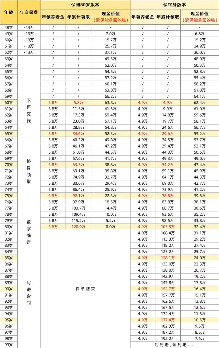 所以,在不考虑退保的情况下,我还是建议大家重点关注每年能领的金额,哪个领的多选哪个。