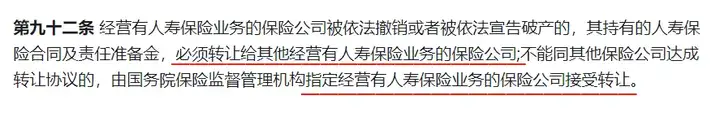 根据《保险法》第92条,保险公司破产后保单必须转让给其他保险公司,合同继续有效。