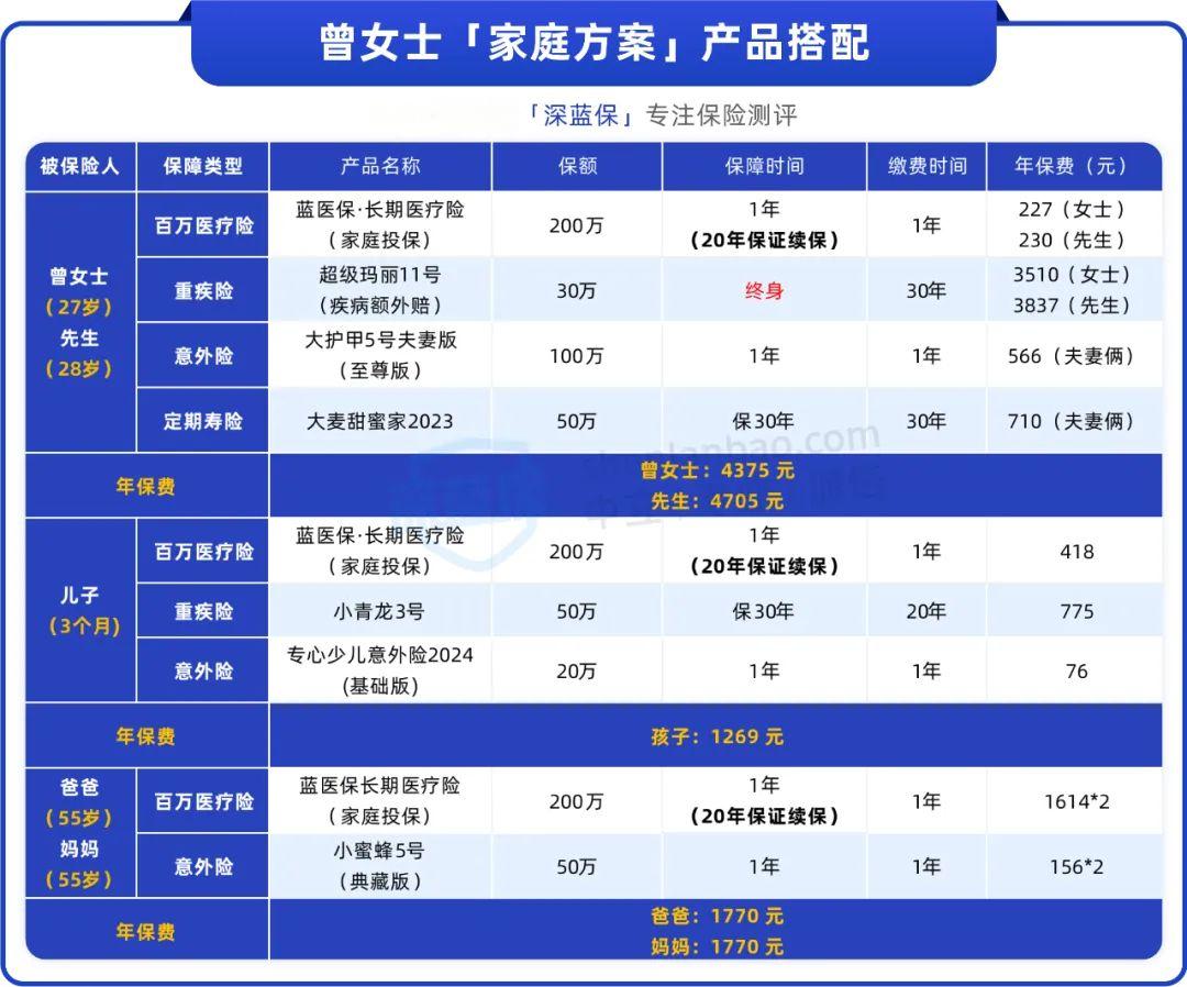 说了这么多,下面我们也给大家分享一家老小的真实方案,还会给大家提示一些保障和理赔注意要点。