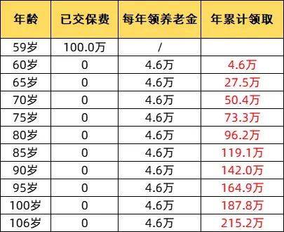 第二年也就是60岁开始,每年都能领4.6万块。