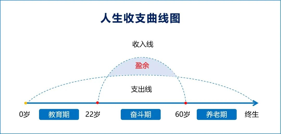 从上图可以清楚看到,支出线横贯我们的一生,而收入线只占中间一段,因此,对于大多数普通人来说,赚钱是一阵子,而花钱却是一辈子。
