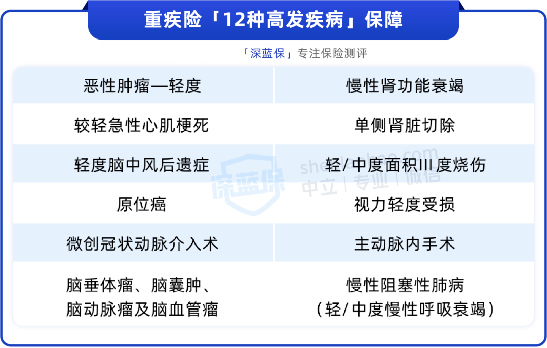 而且,重疾险除了重大疾病还会保障轻中症。轻中症往往是重大疾病的早期状态,发病率更高。下面就是我们总结的12种高发轻中症,大家选择产品时可以重点参考:
