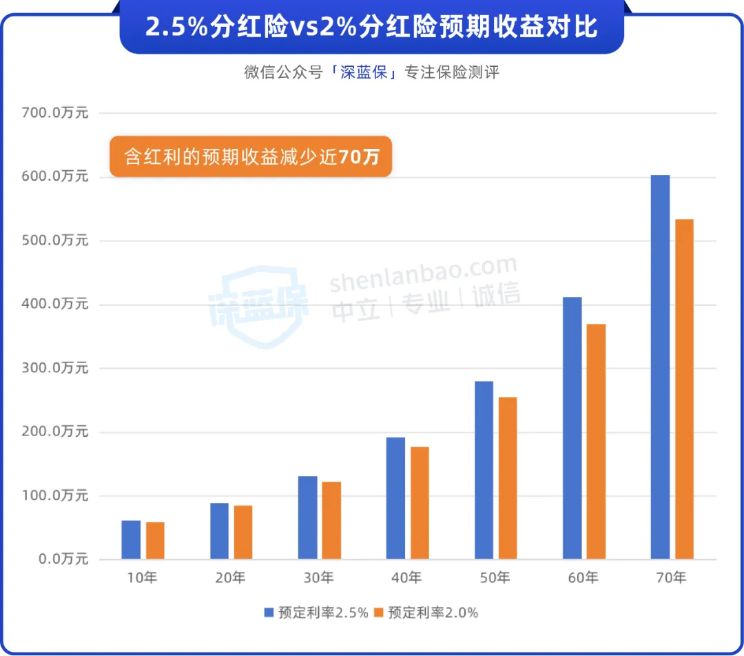 目前,有部分保险公司备案了预定利率2%的分红险,我们拿它跟预定利率2.5%的产品对比看看。