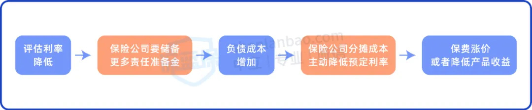 从下图的关系中,我们能看出,如果评估利率降低,保险的预定利率也会下调。想要详细了解的朋友,可点击这里查看。