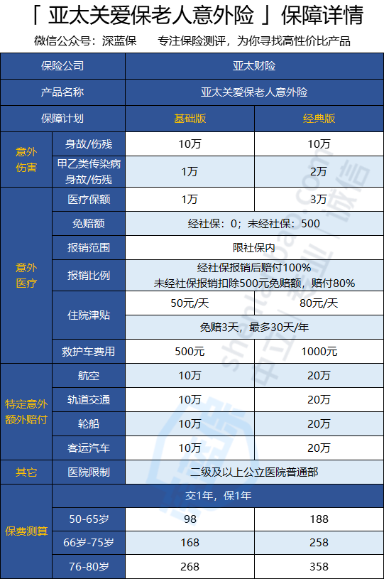 生活从来没有一帆风顺,而意外有时也会让人猝不及防。 小到摔伤烫伤,大到车祸、火灾,每天都会上演。当意外来临时,如果我们人手一份意外险是不是更能从容应对生活中的不幸呢? 今天,深蓝君就给大家测评一款由亚太财险新推出的一年期老人意外险——亚太关爱保老人意外险。 这款产品保障全面,有2款保障计划,意外医疗最高可以买3万,但性价比不高。 下面,让我们一起来看看这款产品保障好不好~ 主要内容如下: 先来看看这款意外险的投保规则: 这款意外险生效时间有点长,而大多数意外险3天之内就生效了。 我们再来看看它的保障内容。 亚太关爱保老人意外险分为2款保障计划,具体保障责任如下: 这款产品保障全面,主要亮点如下: (1)意外医疗保障 一般老人退休后没什么家庭责任,而且老人身体比较弱,一个普通的摔倒,都有可能造成骨折。因此,建议重点关注意外医疗保障,这样会更实用一些。 可选经典版,意外医疗保额最高3万,保障比较充足。 (2)住院津贴和救护车费用 这款产品的住院津贴是50元/天,但有3天免赔额,一年最多赔付30天。另外,还有500元的救护车费用。 (3)甲乙类传染病身故/伤残保障 甲乙类传染病包括:霍乱、鼠疫、新冠、非典、禽流感。 这款产品有甲乙类传染病保障,不过有10天的等待期,如果不幸身故最多可赔付2万元,为易感人群提供了更好的保障。 亚太关爱保老人意外险相比市面上其他的老人意外险,也有一些不足: (1)意外医疗只报销社保内 这款产品只报销社保内费用,如果没有用医保先报销,还要扣除500元的免赔额,赔付比例会略低,只能报销80%。 看完了保障内容,我们再来看看它和其它产品对比,是否值得买呢? 这里深蓝君选择了亚太关爱保老人意外险基础版,和市场上热销的老人意外险来做对比: 直接说结论: 可以看到,相比于其它老人意外险,亚太关爱保老人意外险意外身故/伤残保额不算高,报销限社保内,且未经社保的部分还有500元免赔额,只赔付80%,报销比例略低,价格也不是很便宜,整体来看,性价比不高。 如果想了解更多高性价比的老人意外险产品,可以查看这篇文章:意外险哪个保险公司最好?0岁/20岁/30岁/60岁/70岁意外险推荐清单!