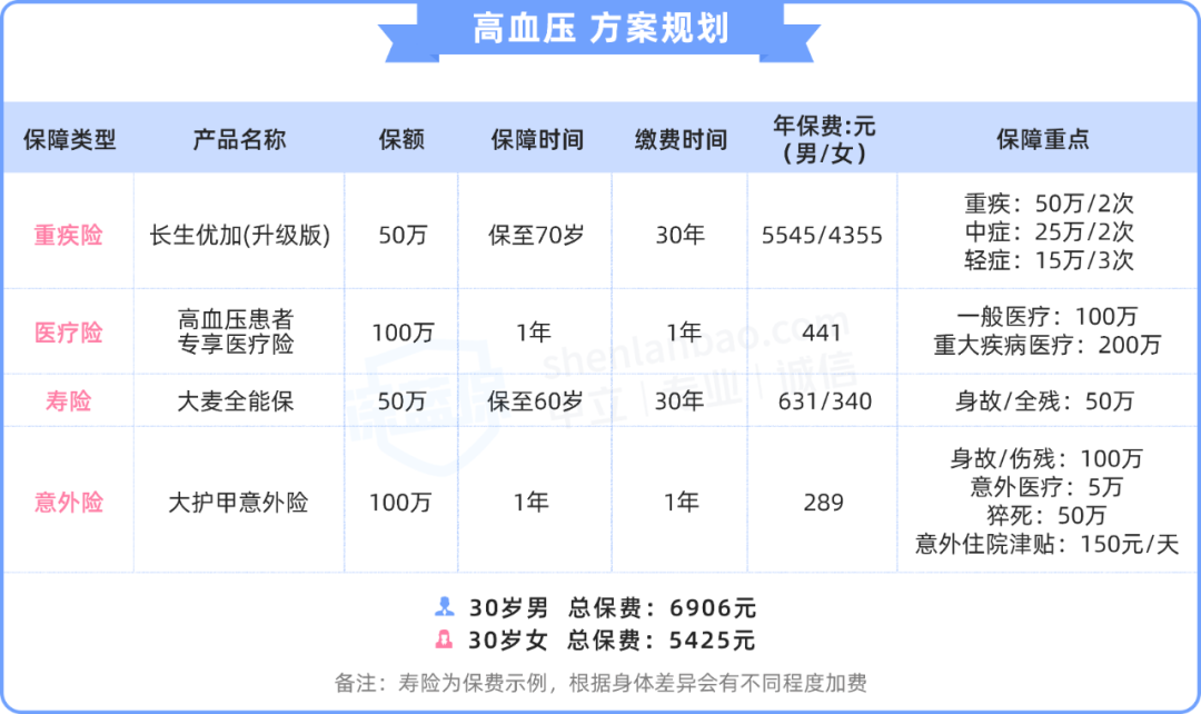 对 30 岁高血压女性患者来说, 5000 块出头能配齐四大险种,保障还是很不错的。
