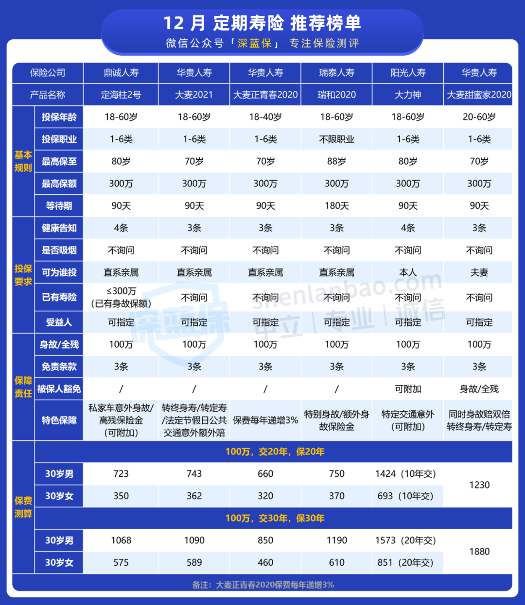 人固有一死,但是许多意外身故,却是家人一辈子的伤痛。定期寿险是成年人必备的保险之一,解决人身故之后的家庭经济问题。精神伤害或许没办法快速弥补,至少能暂时维持家庭生活开支。那么定期寿险哪个好?有哪些挑选要点和注意事项? 关于保障期限,其实是可以根据具体预算来选择的,如果预算有限,可以选择保障 10 年、20 年或至 60 岁。 对于 90% 以上的普通家庭,深蓝君建议定期寿险最长保到 60 岁,因为 60 岁我们已经顺利退休,孩子已经成年,没有太多的责任需要承担了。 关于买多少保额,其实就是如果不幸离开要留给家里多少钱。深蓝君建议主要考虑下面的费用: 对于北上广深背负较大房贷的朋友可以考虑至少 100 万及以上,二线及其他城市可以适当减少。目前市场上有些产品,只要保额不超过 200 万以下都是可以没体检的,购买非常方便。 总体来讲定期寿险健康告知非常宽松,常见的乙肝、结节等都可以投保,并且 1 - 6 类职业可以投保的产品也很多。所以身体如果存在问题,建议你先买一份定期寿险,这样就不会在投保其他保险时,被健康告知中“延期、加费、除外责任”的问询困扰了。 想要简单直接的定期寿险产品推荐,你可以看深蓝君全网搜集的榜单推荐: 测评详情点击这里查看>>>,每月更新榜单推荐,敬请期待! 除了上面长期的问题,深蓝君还建议你了解以下内容: 1、免责条款 免责条款的意思就是,如果发生了条款里面的内容,那么保险公司是不赔的,深蓝君随便找了一款产品的免责条款,具体如下: 在本合同有效期内,因下列原因之一导致被保险人身故,我们不承担给付相应保险金的责任: 对于普通人完全可以不用关注免责条款,如果你实在在意,那么可以选择瑞泰瑞和定期寿险,这是目前深蓝君接触到的免责条款最少的定期寿险,只有前三条。 2、受益人的选择 定期寿险可以指定是受益人,如果发生了理赔,保险金就可以按照比例发给受益人。 定期寿险哪个好?万变不离其宗,挑选定寿的时候,只要明确自己的预算和需求,选择适合的保额和保障期限就好。而且寿险对于健康的要求相对较低,乙肝携带、结节都有机会投保,如果健康告知没能通过,我们还可以试试智能核保,还是有机会的。