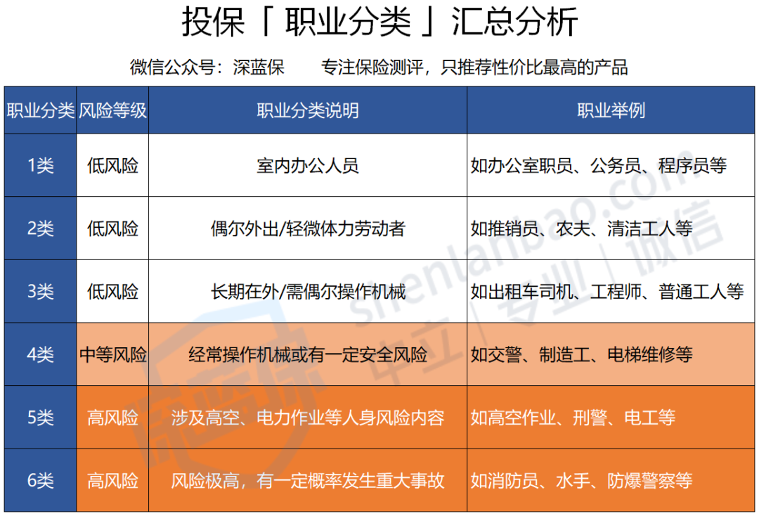 一般来说,保险公司会根据不同风险,将投保的职业分为 6 类。
