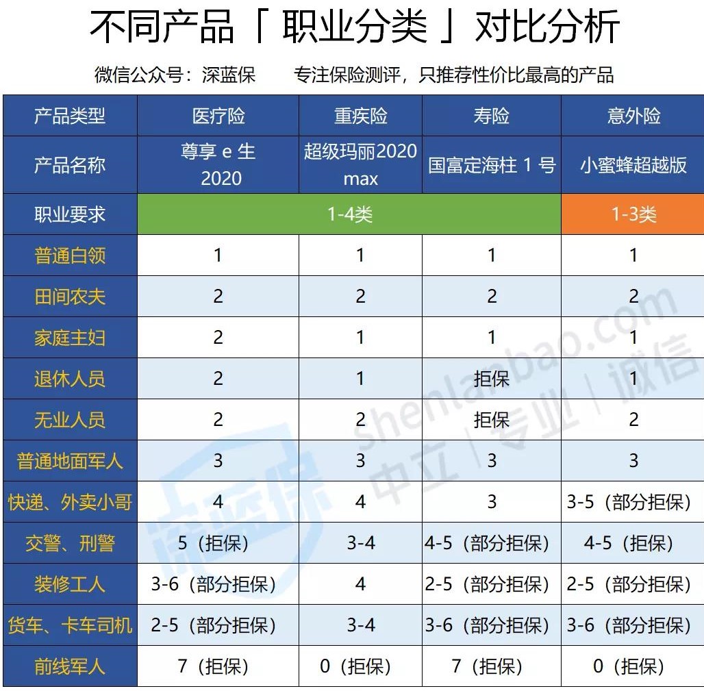 可以看到,在四大险种中,意外险对职业要求最严格,其次是寿险,相对比较宽松的是重疾险和医疗险。