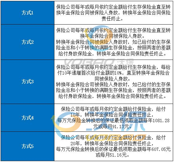 2022平安鑫祥两全保险2017(分红型)的保险金领取除了一次性领取外,还可以选择转换为年金领取,转换的年金保险金额按购买当时保险公司提供的年金领取标准确定,年金转换方式有以下五种可选: