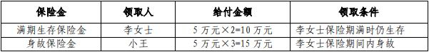 我们以30岁投保的李女士为例,她选择基本保额5万元,分20年交,保至65周岁,则她每年需交保费3330元,指定她的儿子小王为身故保险金受益人,则她能够获得的保障情况如下: