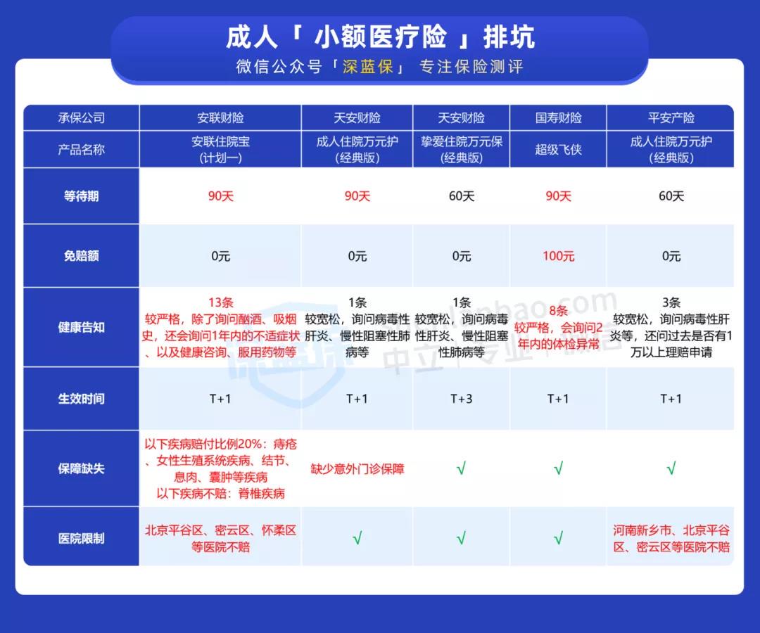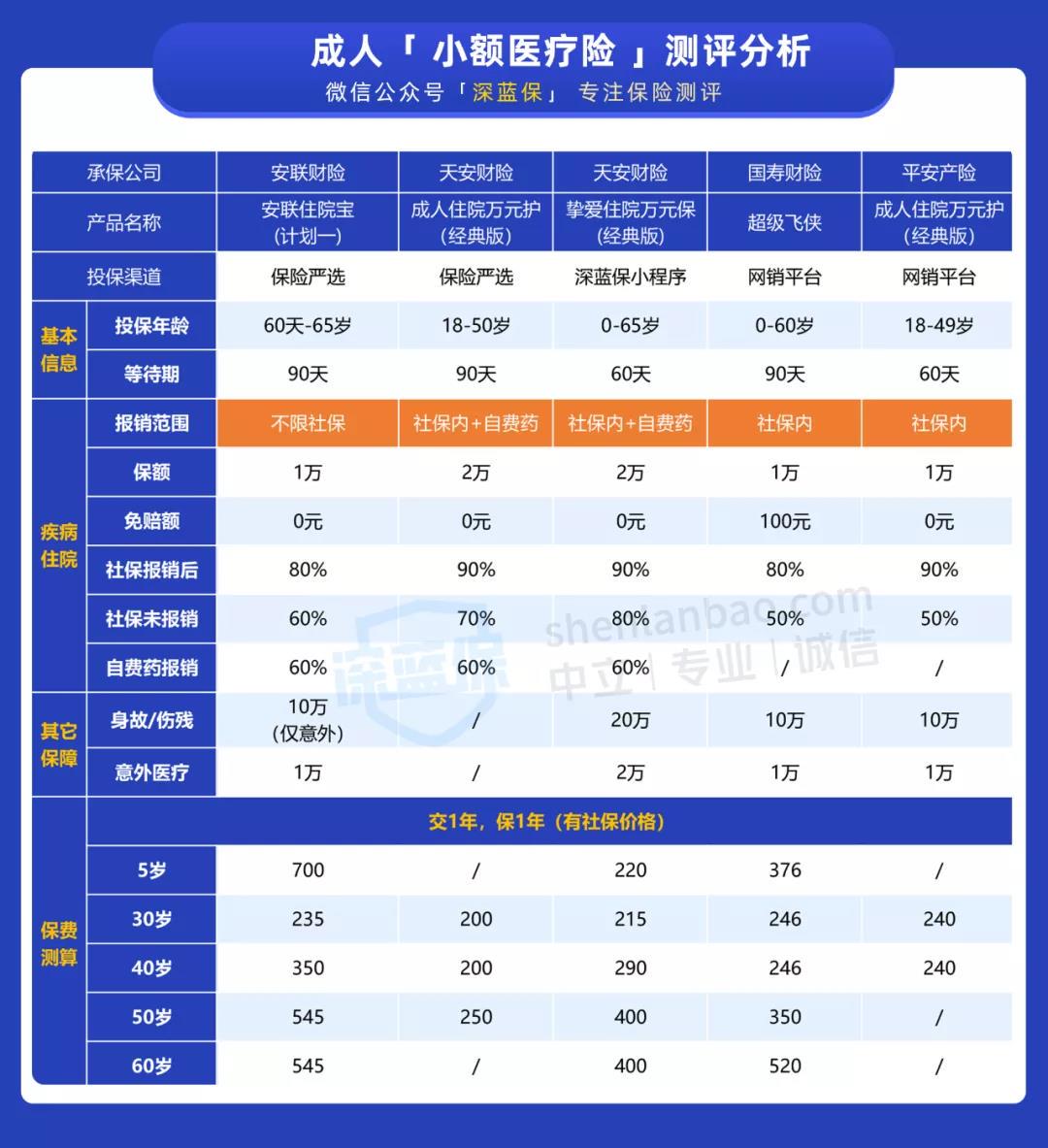 成人的小额医疗险新品比较少,有些产品卖了好几年依旧在卖。这里我们也全网搜索,找到了 5 款性价比高的产品: