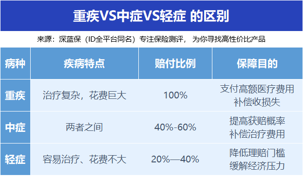 重疾这块我们不用花太多心思,但在轻症和中症方面,由于还没有完全统一标准,所以我们还是得仔细看一下,比如某些高发疾病是不是有缺失,赔付严不严格,赔付比例高不高?