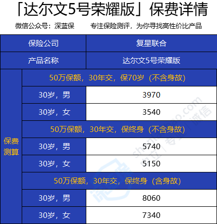 深蓝君以30岁男性/女性,投保50万保额,在选择不同保障期的保费测算如下: