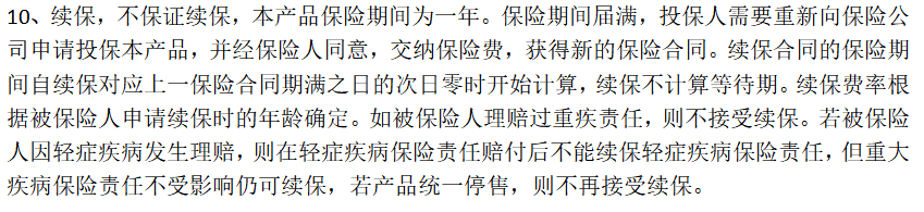 对于这种一年期的保险,很多小伙伴都非常关系细胞条件,专心君去翻阅了保险条款,找到了关于续保条件说明,如下:
