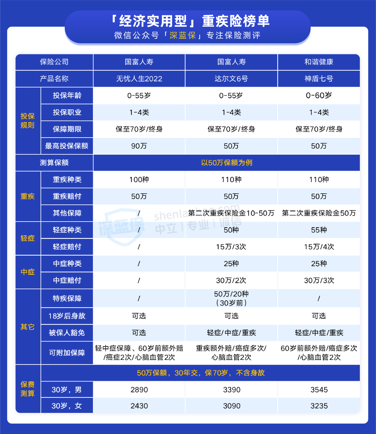 不过市面上的重疾险的五花八门,保障也分三六九等,让无数朋友挠破了脑袋。逐个对比要花费太多时间,为了节省时间,深蓝君不光授人以"渔",现在还把"鱼"也送给大家。