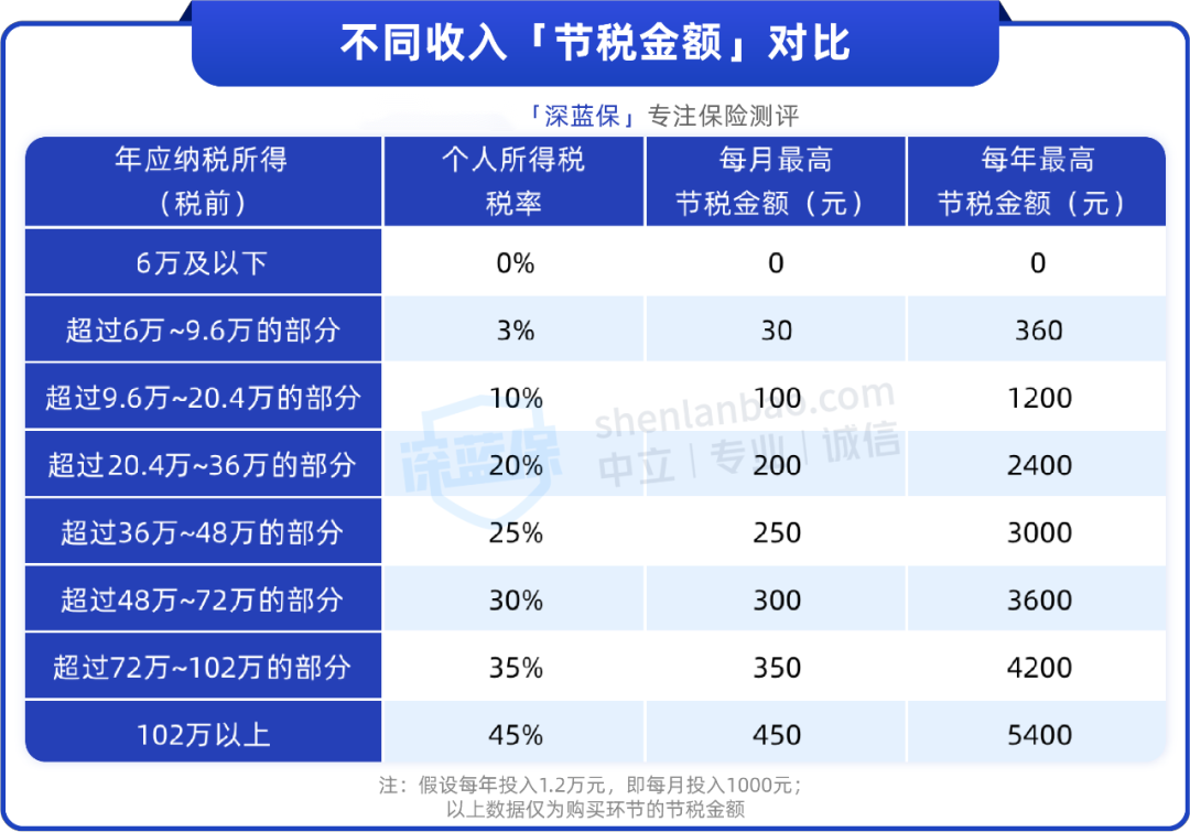可以看到,收入越多,省的税就越多,每年最高可节税1080元。