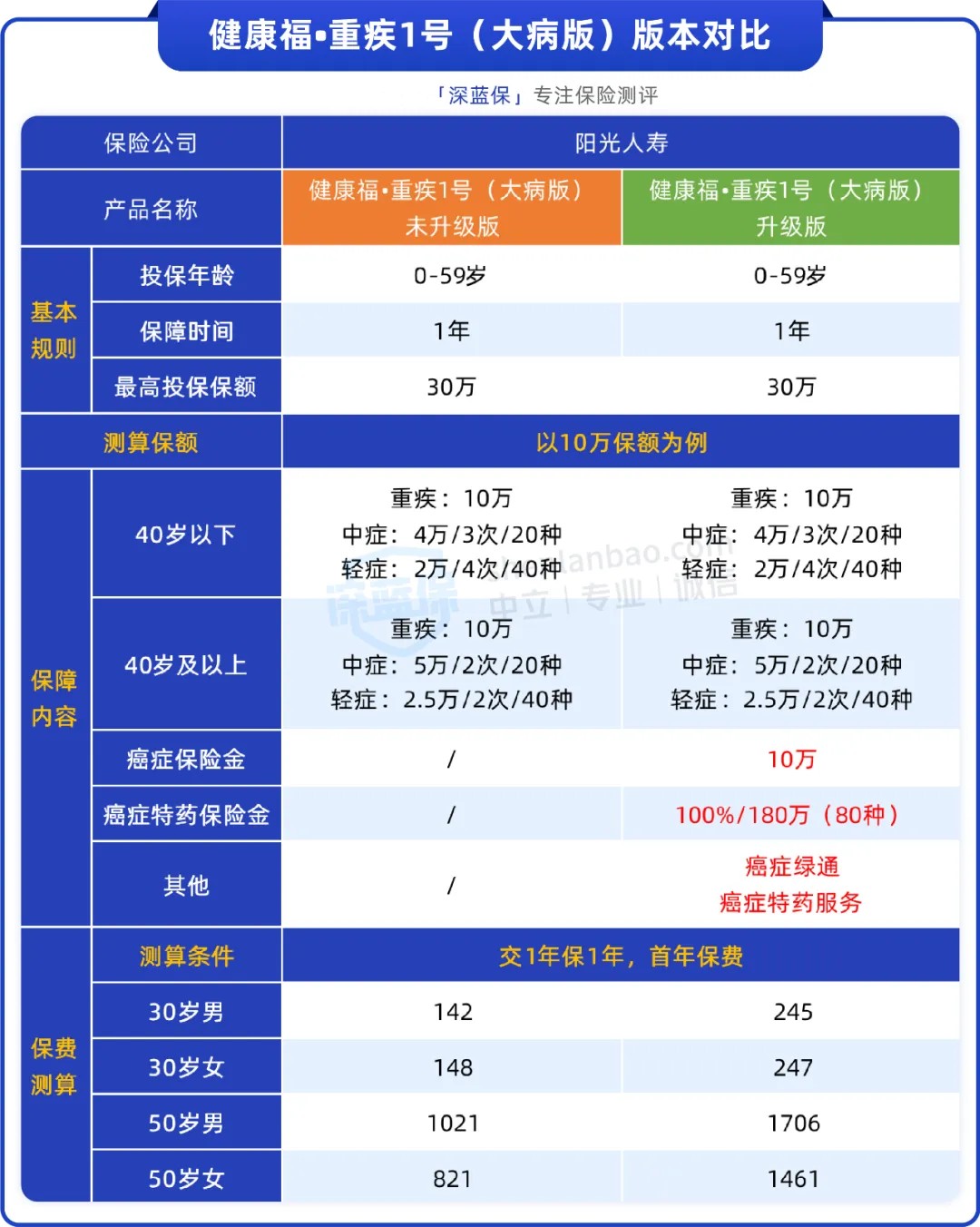 比如20万保额的未升级版本,30岁男性买285元/年,比10万保额的升级版贵个40块,但所有重疾都能赔20万。