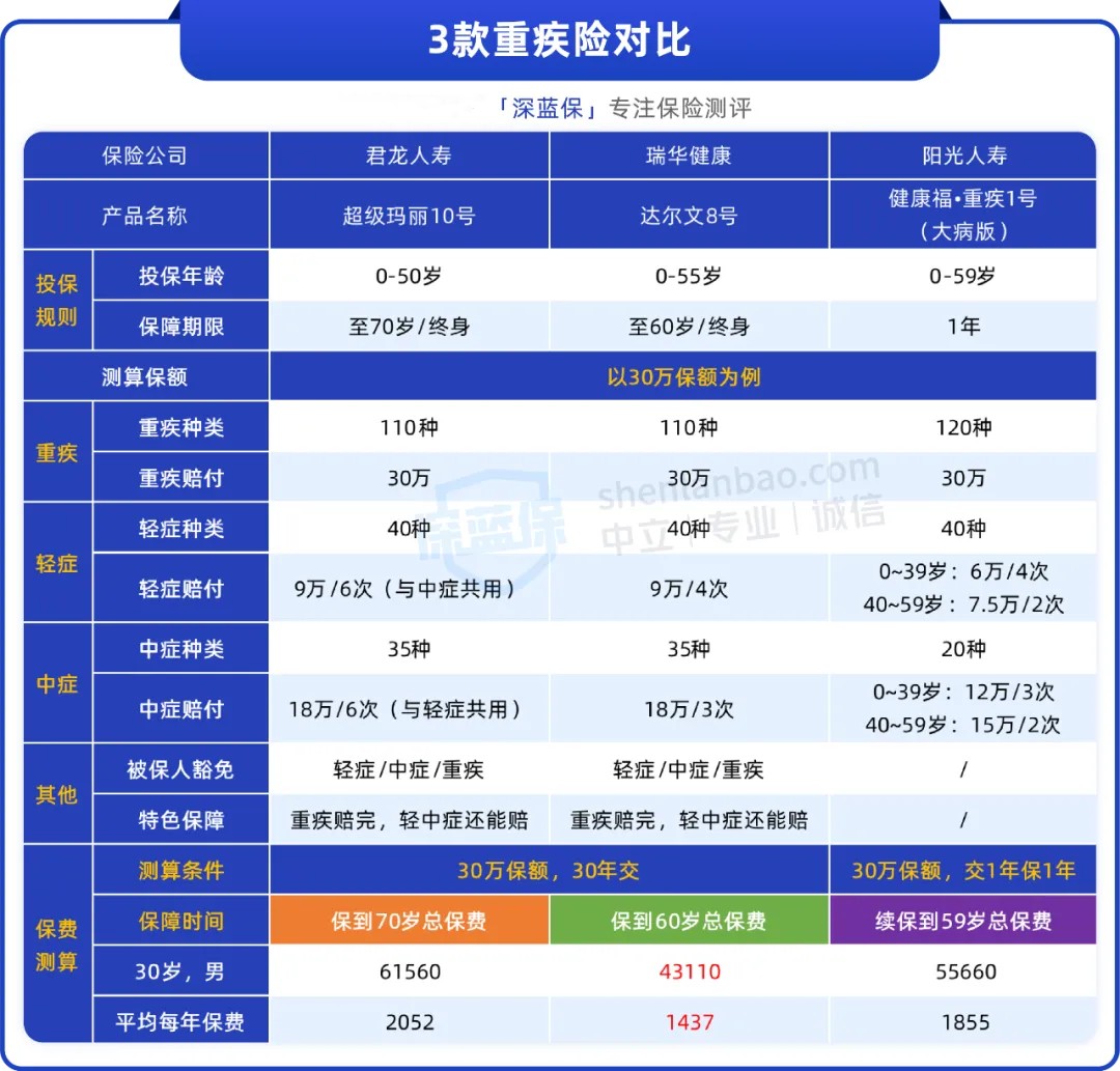 「健康福•重疾1号(大病版)」40岁以上轻中症保额高一点,女性价格便宜一点,「全民守护•重疾险」男性价格便宜一点。