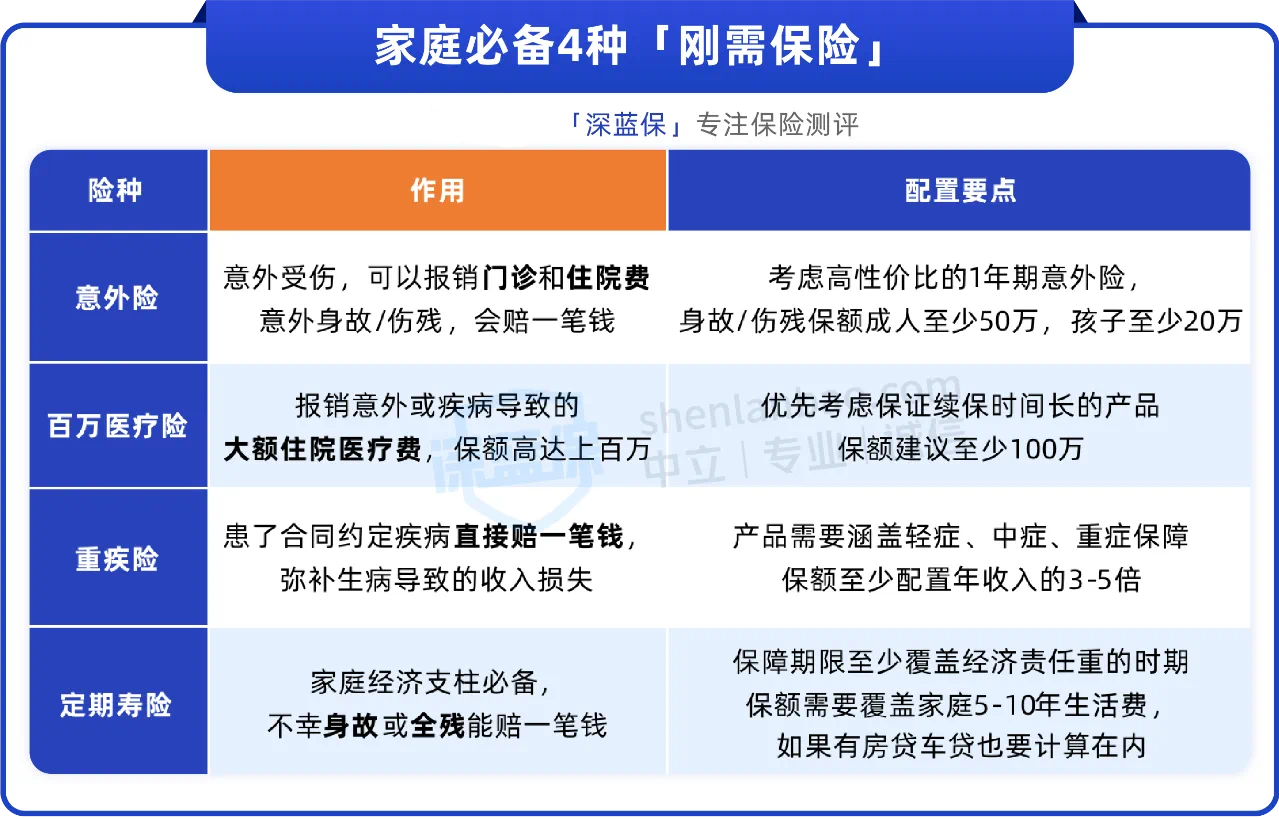 综合来说,商业保险必买的险种主要有意外险、百万医疗险和重疾险,家庭经济支柱还可考虑配置定期寿险,以此转移疾病、意外和早逝带来的经济风险。