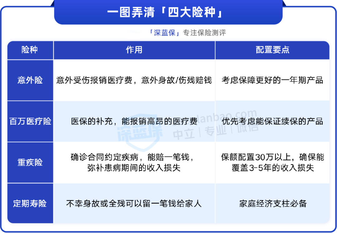 从图中我们可以看到,不同保险的作用是不同的,要想获得全面的保障,则需配置齐全百万医疗险、重疾险、意外险、定期寿险这四大险种。