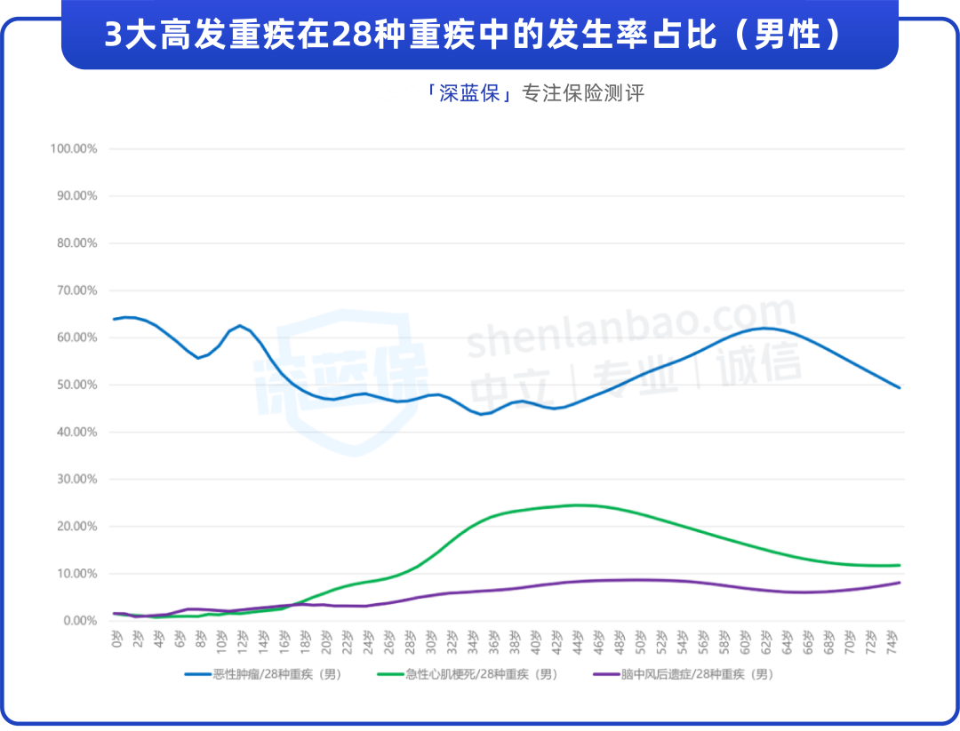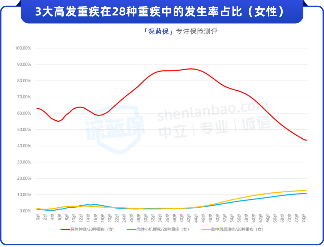 可以看到,在28种高发重疾中,女性的癌症发生率占比是最高的。尤其是在24~60岁之间,癌症发生率达到70%以上,远高于男性。