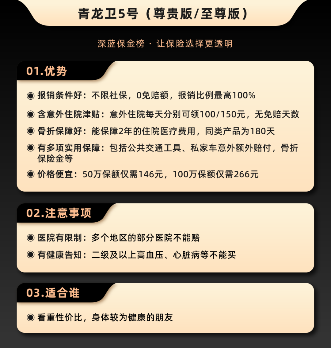青龙卫5号由大地财险承保,50万和100万保额的版本都值得选,整体如下: